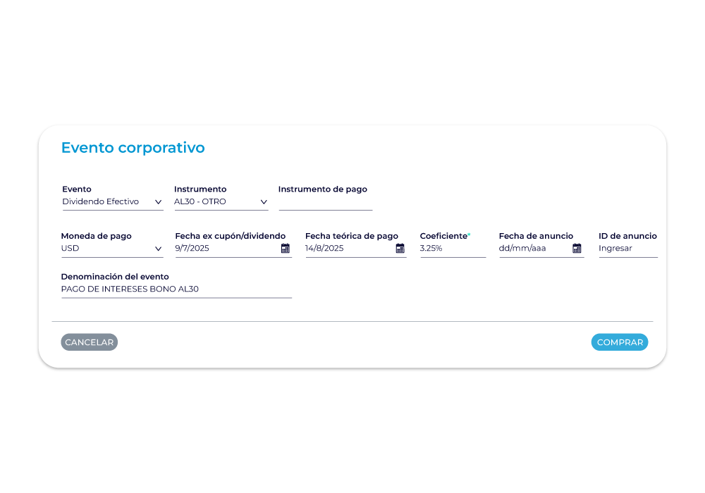 Gestione con precisión cobros de intereses, amortizaciones y otros eventos relacionados con títulos en cartera.