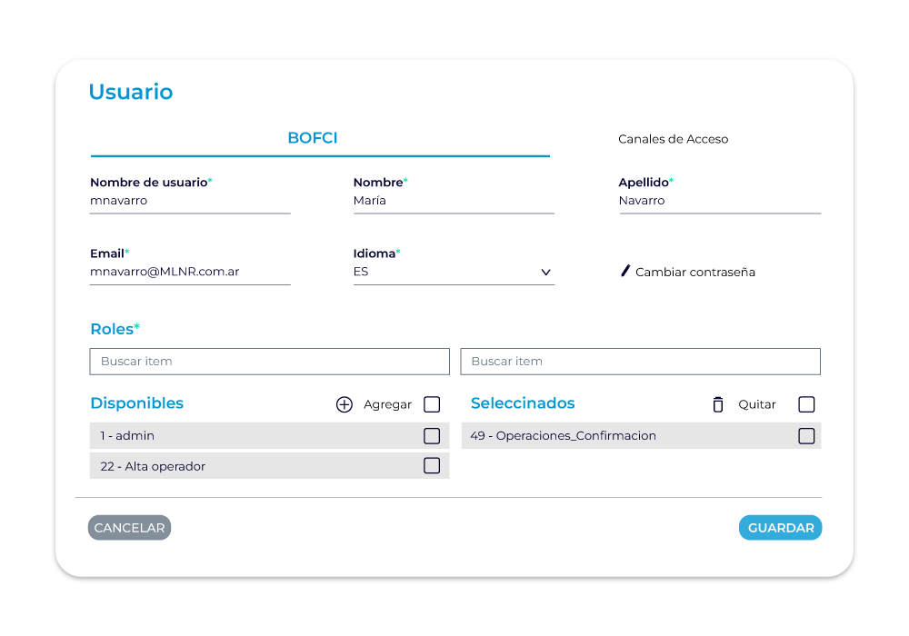 Configure perfiles según funcionalidades y niveles de acceso, controlando riesgos operativos y normativos, ajustando la visualización de monitores a cada usuario.