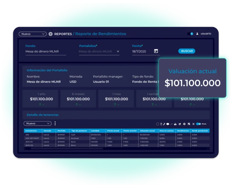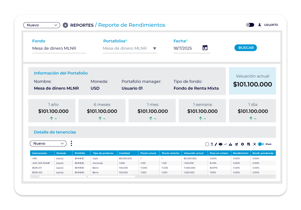 Acceda a reportes clave de exposición, rendimiento acumulado y Value-at-Risk para evaluar su desempeño y anticipar escenarios.